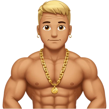 a 20 year old blond man with blue eyes, very muscular with abs, shirtless with sports shorts emoji