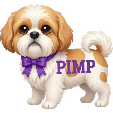 shitzu dog with two purple ribbons. it has a lettering "PIMP" emoji