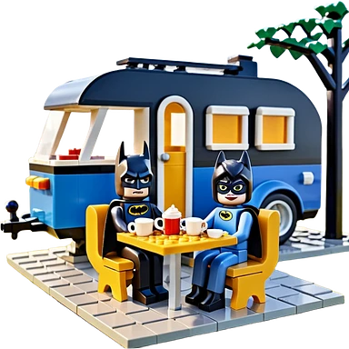 Ultra cute futuristic Lego detailed Batman and pretty Catwoman dream house Caravan with picnic table and folding chairs alone at romantic afternoon (hot chocolate and cheeseburgers on the grill) emoji