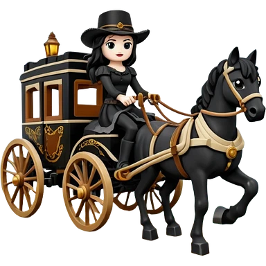 Rustic all black Lego antique wood Barbie Gypsy 1854 pretty dark-haired Catgirl driving a huge horse-drawn fancy French stagecoach Caravan on a bumpy scary ghost trail in the woods emoji