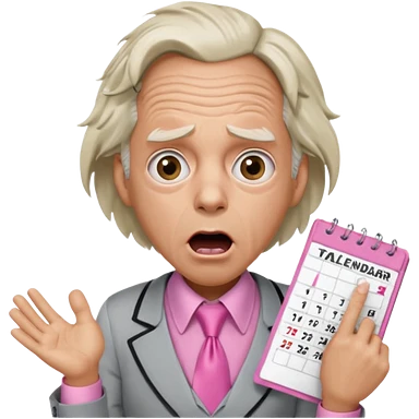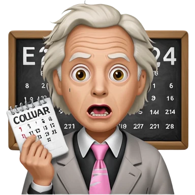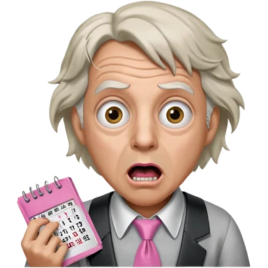 Doc Brown, in Back to the Future, looking shocked, mouth wide open, with a shocked expression. Without glasses. Wearing a silver dress with black trim, a pink collared shirt and a white tie, holding a calendar. emoji