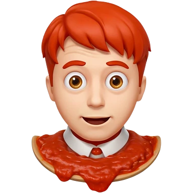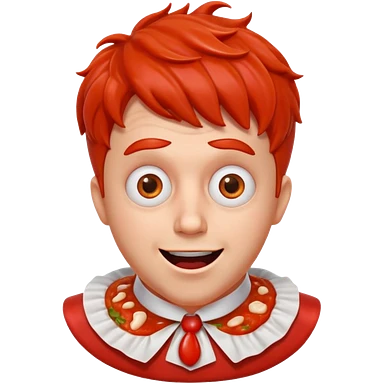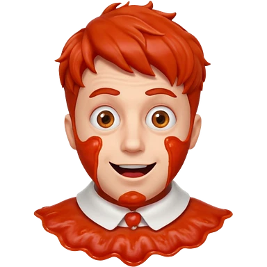 funny theater actor portrait, head and shoulders only, covered in tomato sauce, shocked wide eyes, awkward smile, stage costume collar, 3D cartoon, mobile game icon style, clean background, no text, no watermark emoji