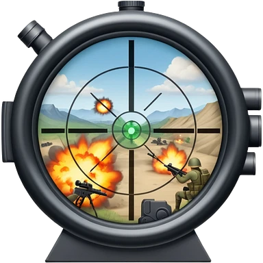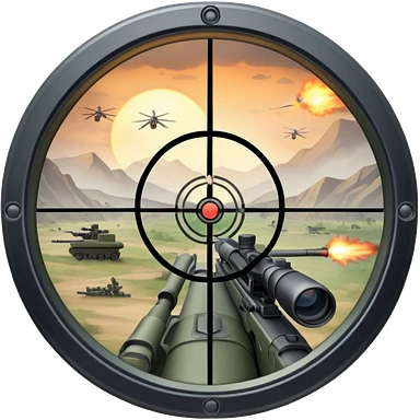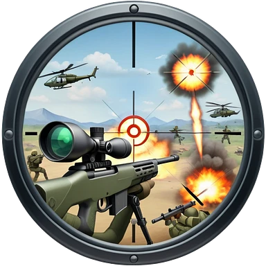 An icon symbolizing first-person shooter games. The design features a scope view with crosshairs aimed at a distant target. The background shows a battlefield with soldiers and explosions, capturing the action-packed intensity of FPS games. Transparent background. emoji