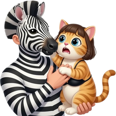 human zebra male biting the cat human chest. a human girl cat wearing black bikini and a short hair. make the cat scared emoji