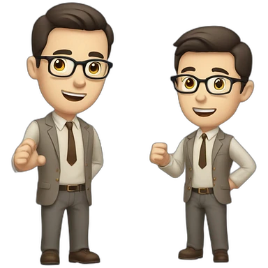 To belt Actively gesturing with hands Pale skinned fit man teacher with dark brown hair in gray jacket, beige office shirt, brown tie, brown pants and vintage glasses. emoji