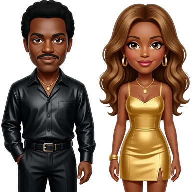 Ike Turner with dark skin, brown eyes, black hair, black metallic shirt and baggy pants, necklace, Tina Turner with long golden brown hair, gold short dress, gold earrings emoji