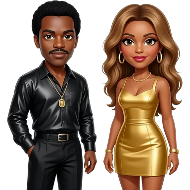Beyonce with hazel eyes, long golden brown hair, gold short dress, gold earrings, Jay-Z with dark brown eyes, black hair, black metallic shirt and baggy pants, necklace emoji