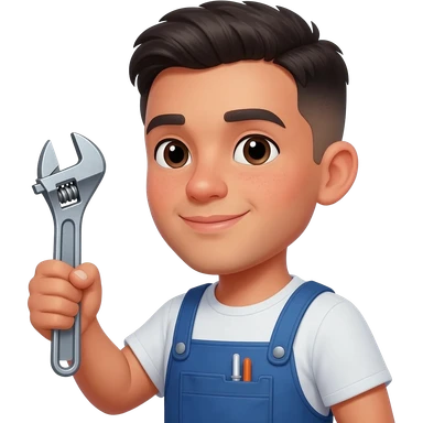 Young Hispanic plumber with short hair with a line up and a pipe wrench in is hand emoji