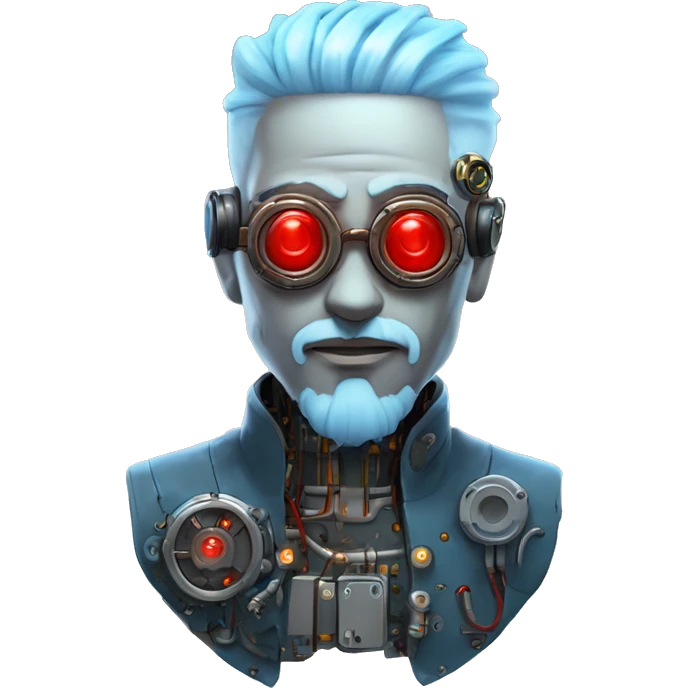 Short light blue haired male cyborg head with light blue beard, red steampunk goggles and circuits emoji | AI Emoji Generator
