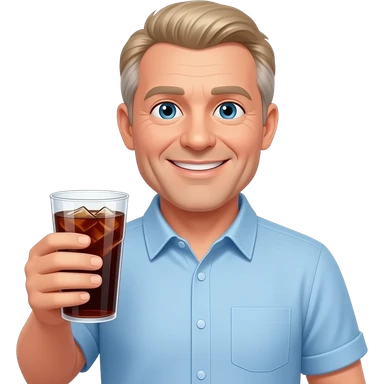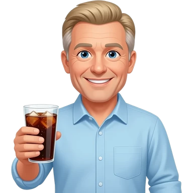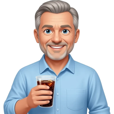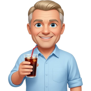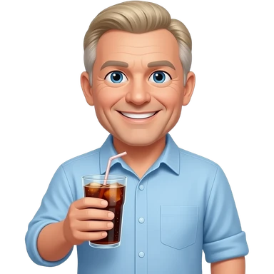 show me a pale white man smiling -with a round face- in his 50s in a light blue button down shirt-- clean shaven -with blond salt and pepper hair holding a cup of soda emoji