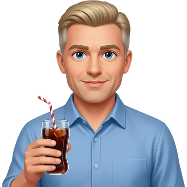 show me a pale white man in a blue button down shirt-- clean shaven -with blond salt and pepper hair holding a cup of soda -- make him not as attractive emoji | AI Emoji Generator