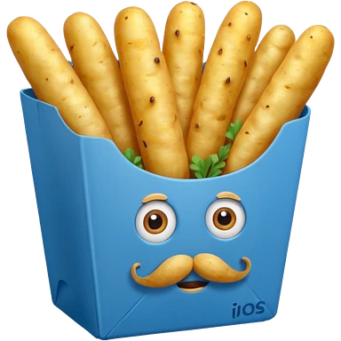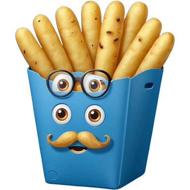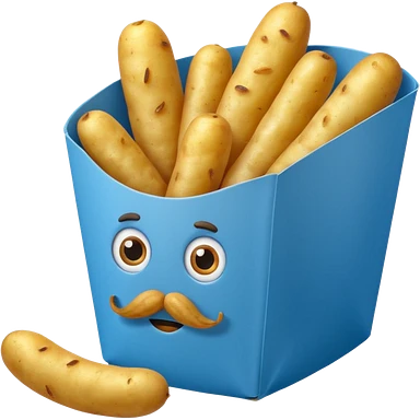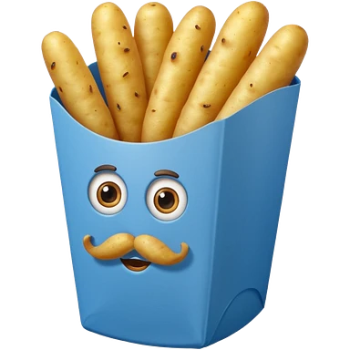 long slim fried potatoes in a blue carton, carton has eyes and mustache emoji