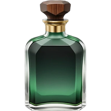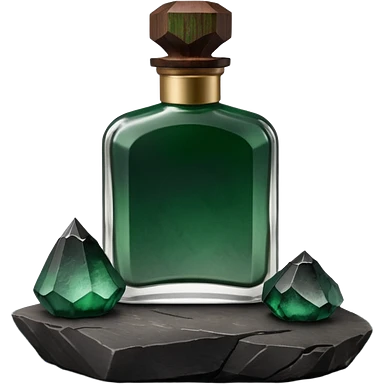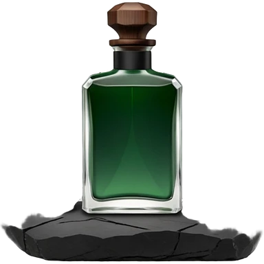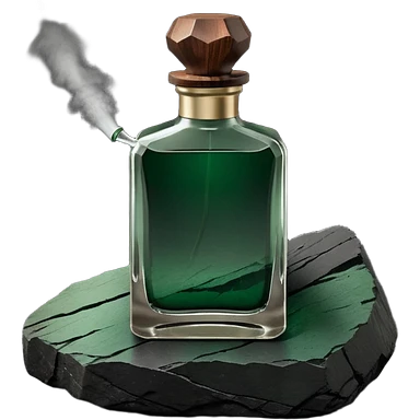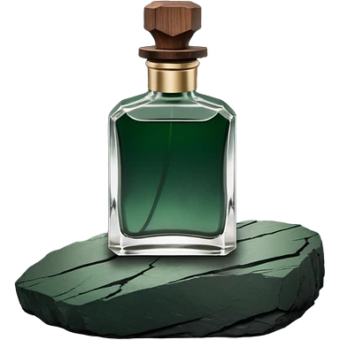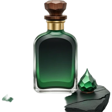 A masculine fragrance bottle featuring a gradient of deep forest green to charred black glass. The cap is made of dark walnut wood. The bottle is placed on a jagged piece of slate rock with a faint mist in the background. Earthy, moody, textured, photorealistic. emoji