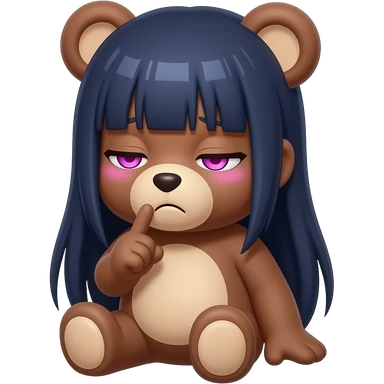 A brown teddy bear half body giving look like shy hinata from naruto sideways looking male bear, he shy and looking down. He is also touching his index fingure and pink glow under eyes just like an anime character emoji