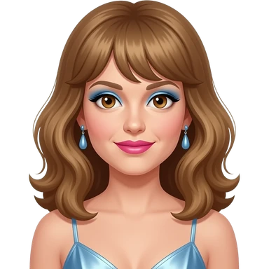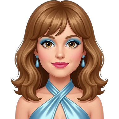Linda Blair with brown eyes, long light brown 70s shaggy 20 inch hair, blue eyeshadow, hot pink lipstick, light blue metallic halter dress, earrings emoji