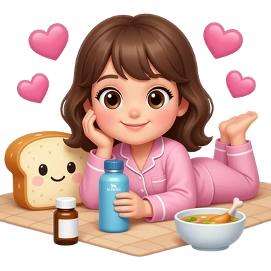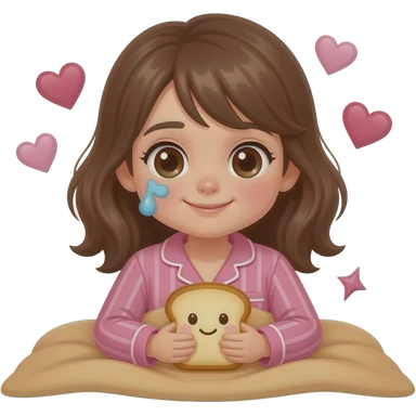 Light brown blanket and bread plushie sick day with a girl with brown hair and pink pajama and hearts emoji