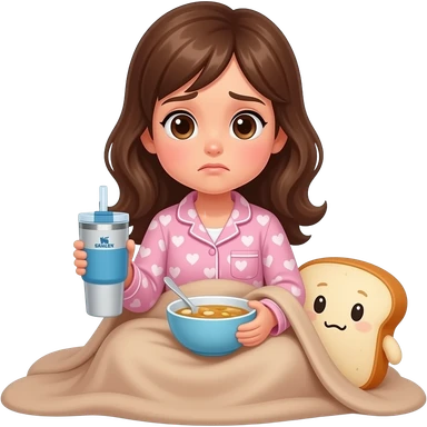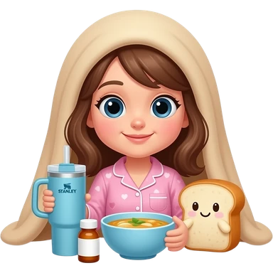 Light brown blanket and bread plushie sick day with a girl with brown hair and pink pajama and hearts and a Stanley blue and a medicine and a chicken soup emoji