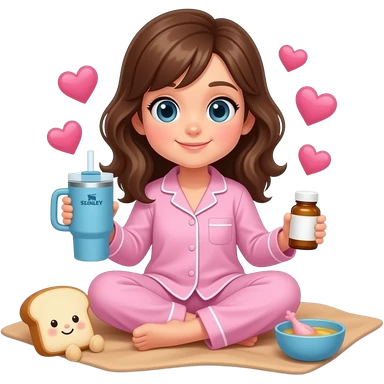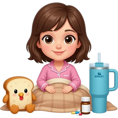 Light brown blanket and bread plushie sick day with a girl with brown hair and pink pajama and hearts and a Stanley cup blue and a medicine and a chicken soup emoji