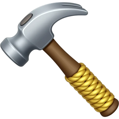 Cartoon hammer only, silver metal head, brown wooden handle with yellow rope wrap, cute 3D emoji style, transparent background, front view, isolated emoji