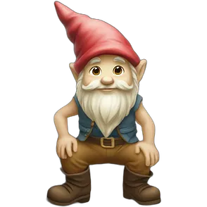 side view of gnome with light tan pants and boots squatting above small dirt emoji