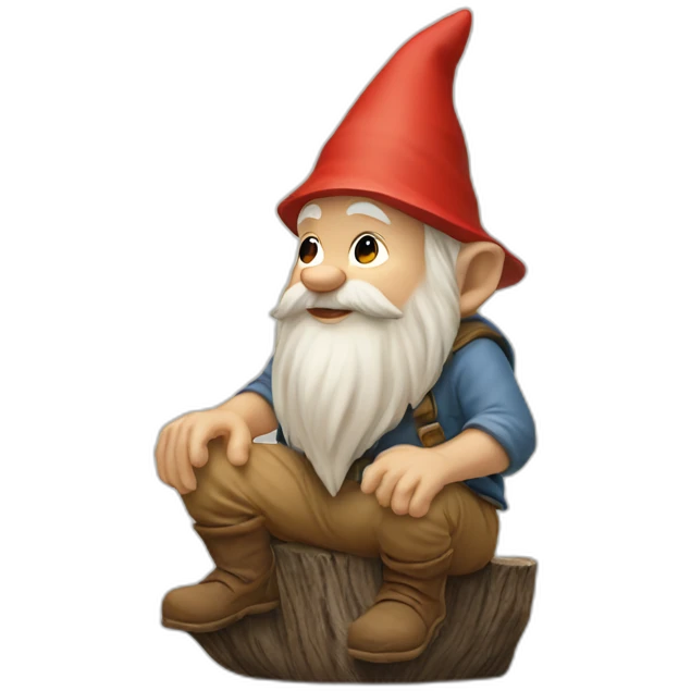 side view of gnome with light tan pants squatting on top of small brown log emoji