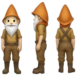 side view of gnome with light tan pants and light tan boots squatting in front of small dirt pile emoji
