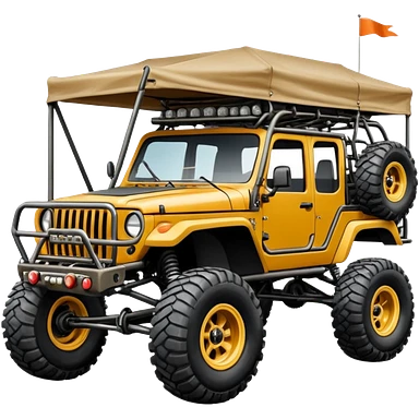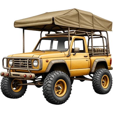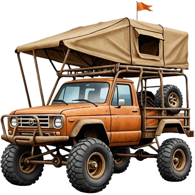 Well-equipped Off road Race truck whose frame and detailed suspension is made of shopping cart material with padded roll cage, huge roof rack, winch, and antique style handmade bodywork (survivalist style) emoji