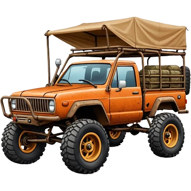 Well-equipped Off road Race truck whose frame and detailed suspension is made of shopping cart material with padded roll cage, roof rack, winch, and antique style handmade bodywork (survivalist style) emoji