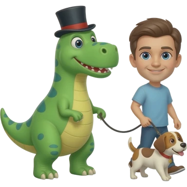 Silly dino with top hat and a human walking it on a leash like a dog. emoji