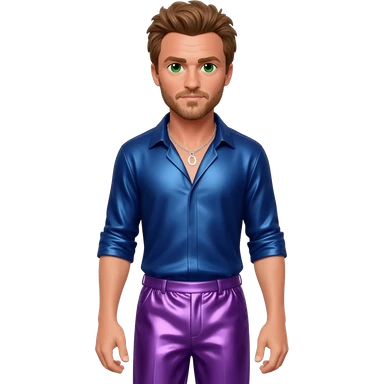 Jeremy Renner with green eyes, sandy brown hair, indigo metallic shirt, purple metallic baggy pants, silver necklace emoji