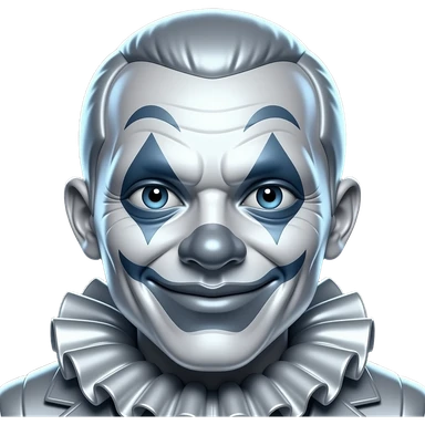 Silver clown, black background, high contrast, mostly monochrome, minimalist futuristic design, metallic texture, smooth surface, smooth texture with soft neon hues, smooth, futuristic, minimalist emoji