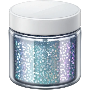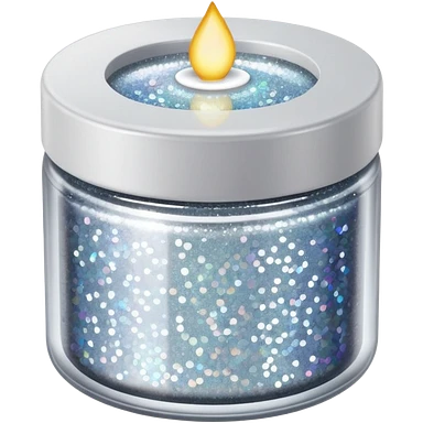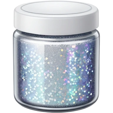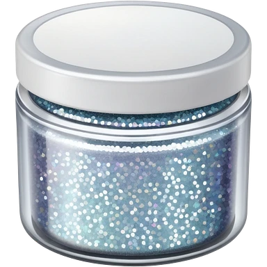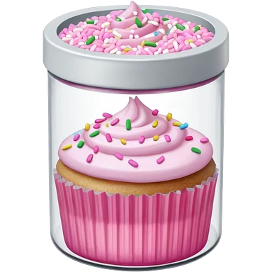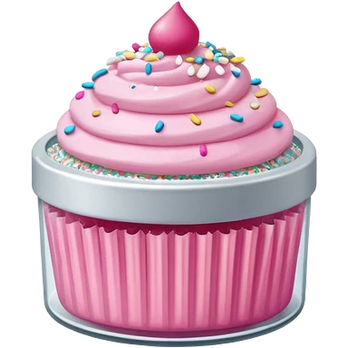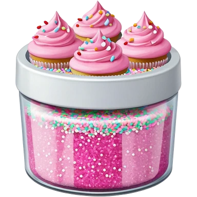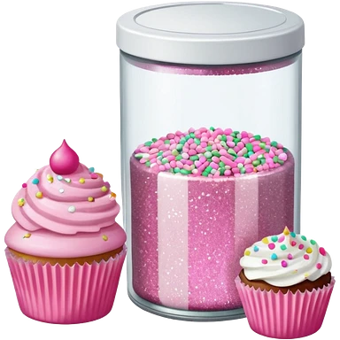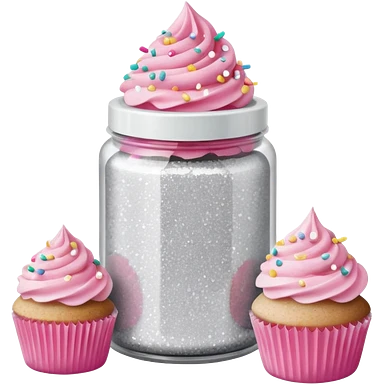 silver glitter in a small clear circular container with white lid next to a can of sprinkles and pink cupcakes emoji | AI Emoji Generator