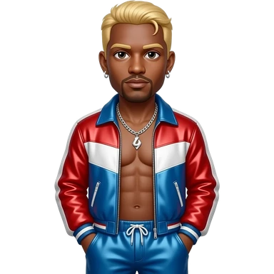 Vanilla Ice, Rapper with blonde hair, red, white and blue metallic jacket, red, white and blue metallic baggy pants, shirtless with silver necklace and earrings emoji