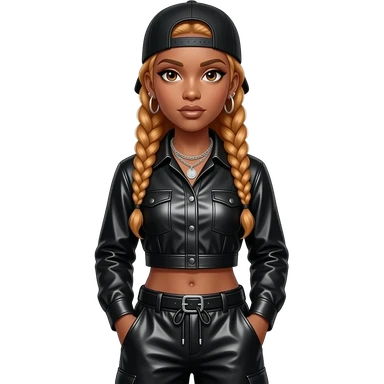 Da Brat, Female Rapper with long coppery blonde braided hair, black metallic shirt, black metallic baggy pants, silver necklace and earrings emoji