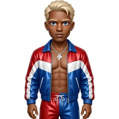 Vanilla Ice, White Rapper with blue eyes, blonde hair, red, white and blue metallic jacket, red, white and blue metallic baggy pants, shirtless with silver necklace and earrings emoji