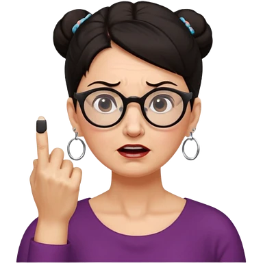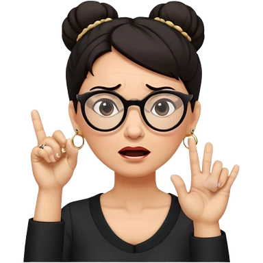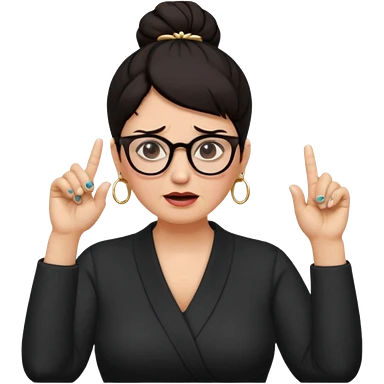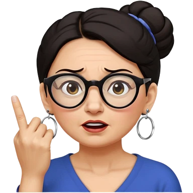 middle aged woman with dark hair pulled up in a high bun, wearing round ring earrings and glasses blocking her ears with her index finger, with a very painful expression on her face because she cannot stand hearing a terrible singer who is too loud and out of tune. emoji