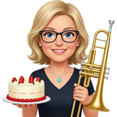 AJM - woman, mid 40's, strawberry blonde hair, blue eyes, diamond engagement ring, small silver earrings, rectangle glasses, freckles, tiffany heart necklace, hobby playing trombone and making cakes emoji
