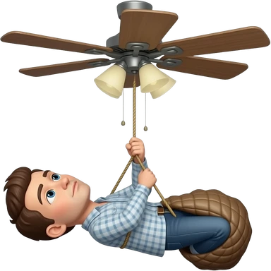 A man hanging to ceiling fan with string doing suicide emoji