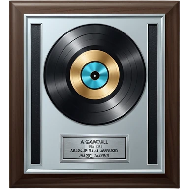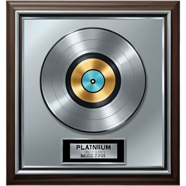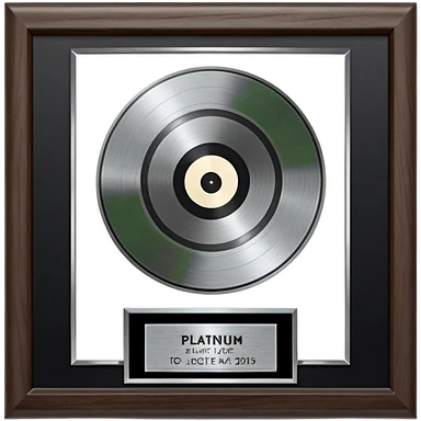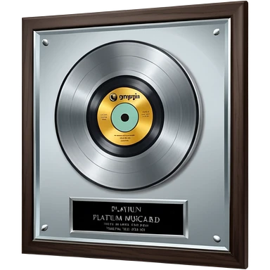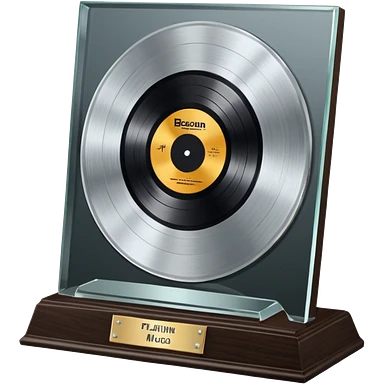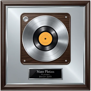 A platinum music award plaque: a square, polished platinum plate with a subtly textured, mirror-like finish, mounted on a simple dark wood base. The center features a relief of a or stylized vinyl record in a slightly darker metallic tone. emoji