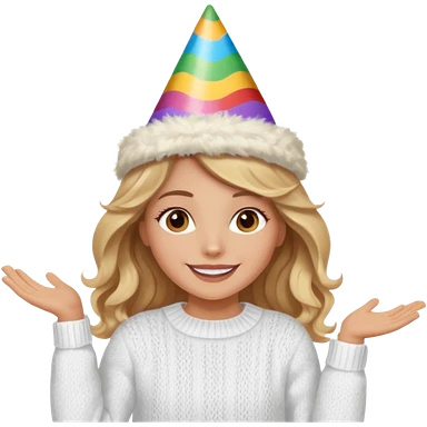 A pretty white girl with hazel brown eyes and long brown and blonde wavy hair in a cosy white knit sweater, she is celebrating her birthday and is happy emoji