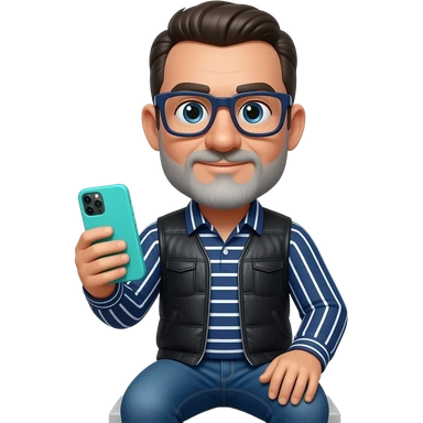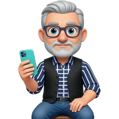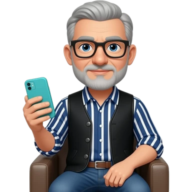 Señor sentado orejas grandes gafas cuadradas azul oscuras nariz grande y un poco de barba gris clara y poco pelo canoso Está con un teléfono móvil de funda turquesa y una camisa azul marino con líneas blancas verticales y horizontales encima un jersey sin mangas negro y vaqueros azules. emoji