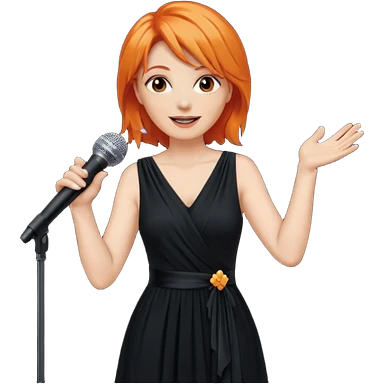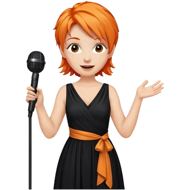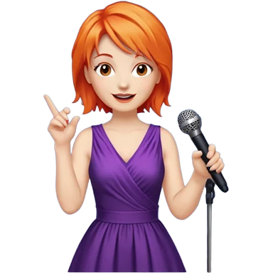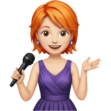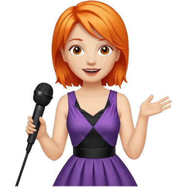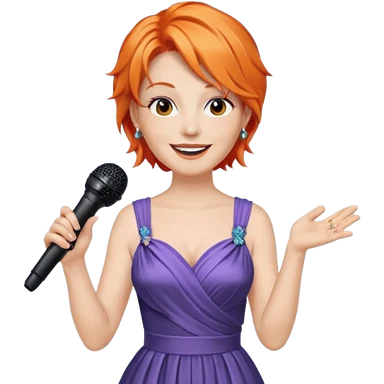 singer, Middle age, orange hair, happy, holding mic, wearing dress emoji | AI Emoji Generator