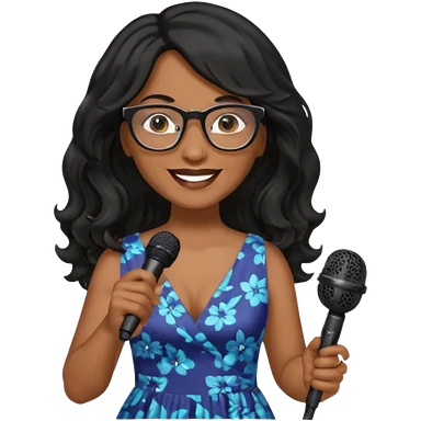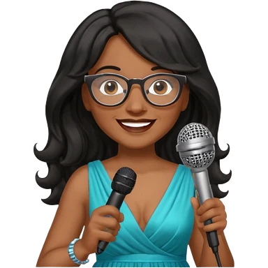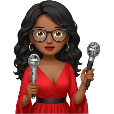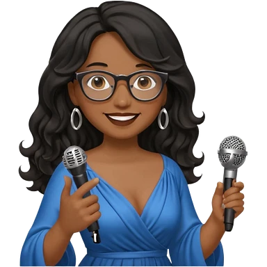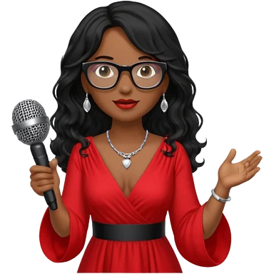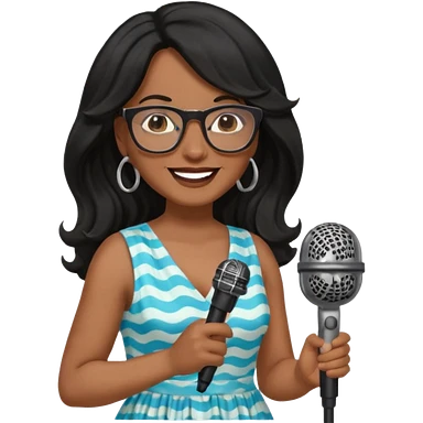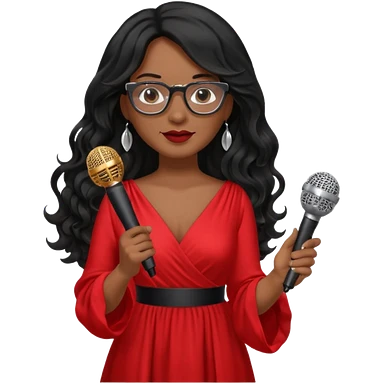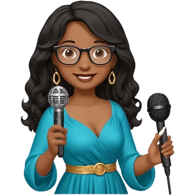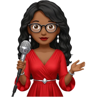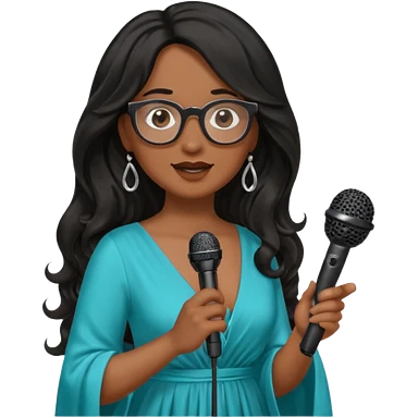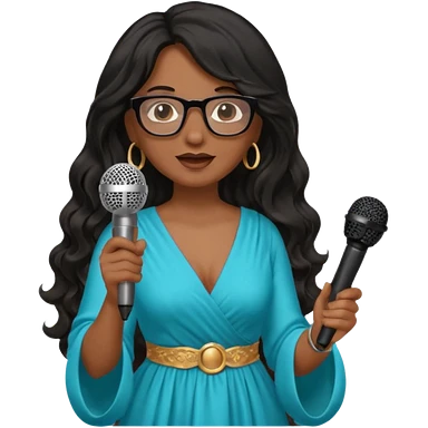 singer, Middle age, long wavy black hair, brown skin, wearing dress, holding mic, glasses emoji