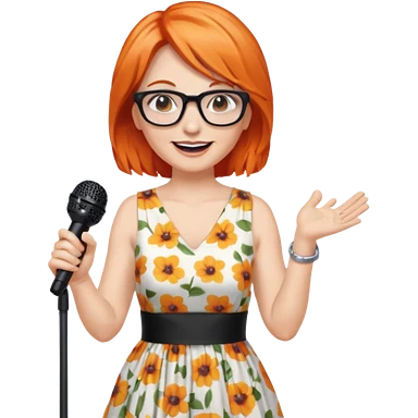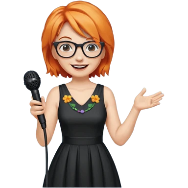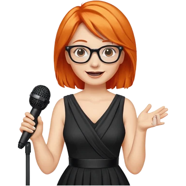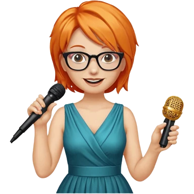 singer, Middle age, orange hair, happy, holding mic, wearing dress, glasses emoji