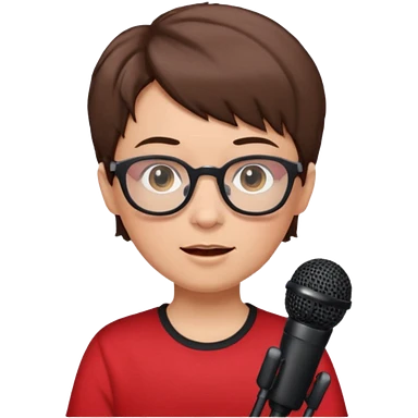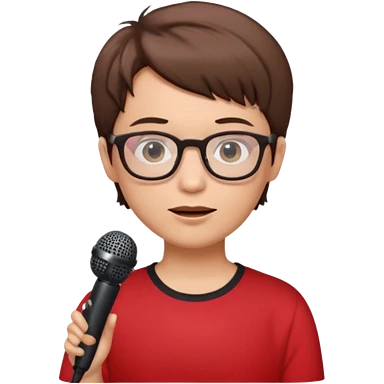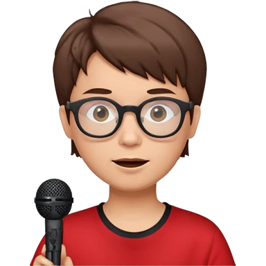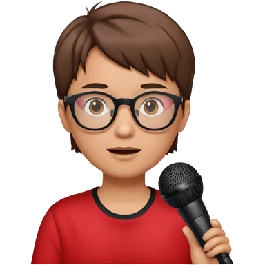 singer, Old, brown short hair, holding mic, red shirt glasses emoji