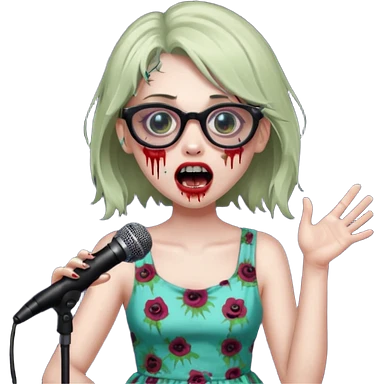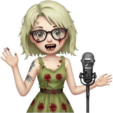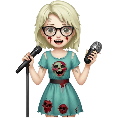 singer, Zombie girl, super happy, wearing dress, singing to mic, glasses emoji