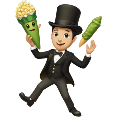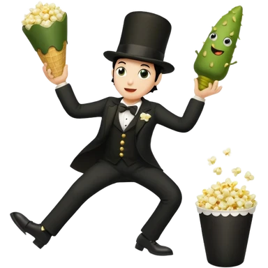 Popcorn cone traffic dancing 3 legs 2 on the floor his 3rd arm is holding his 3rd leg and 1 pickle dipped in ranch on his black top hat emoji