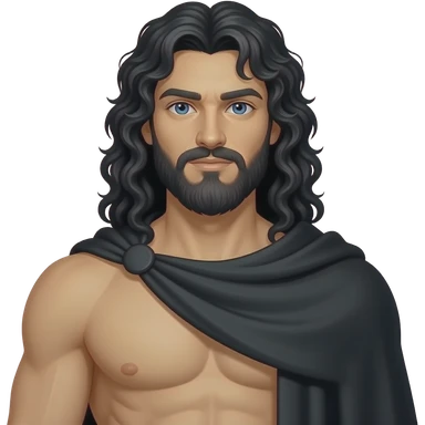 Pluto from Roman Mythology with indigo eyes, long black curly hair and beard, black cloak, shirtless emoji