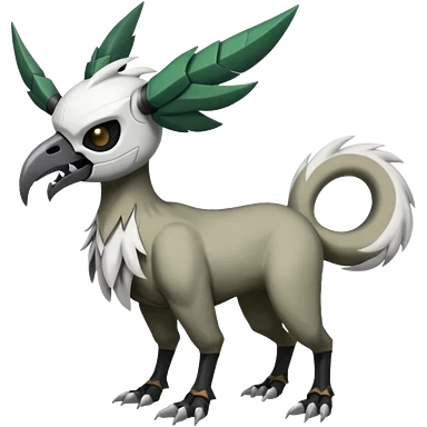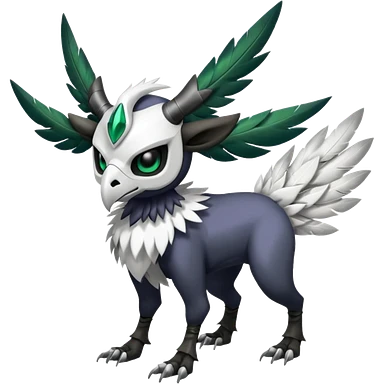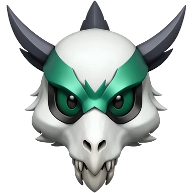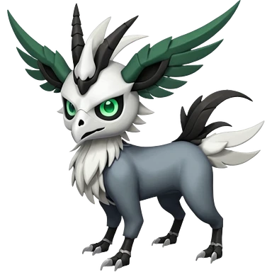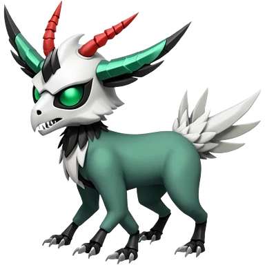 Shiny Black Grey White and Dark-Green Trico-Skarmory-Silvally-Skiddo-Sprigatito-Absol-fusion (full body) with and edgy white horned skull mask face emoji