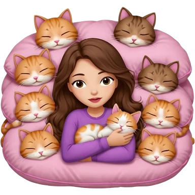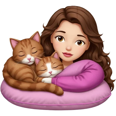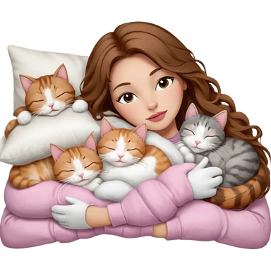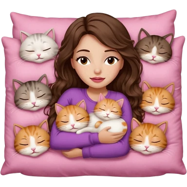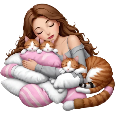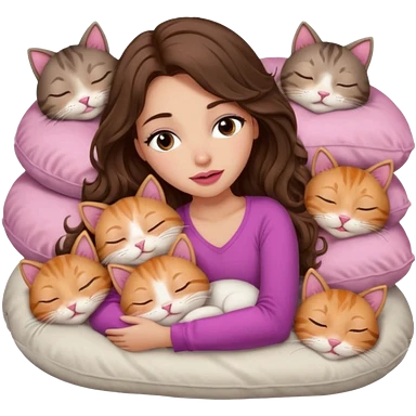 girl with long wavy brown hair, brown eyes, long lashes makeup, sexy pink lips, light to medium complexion, sleeping on a cozy pillow, with 6 cats: 1 brown and white tabby cat, 1 ginger and white, 2 grey and white, 1 grey with white mittens and small white patch on chest and 1 calico, sleeping emoji